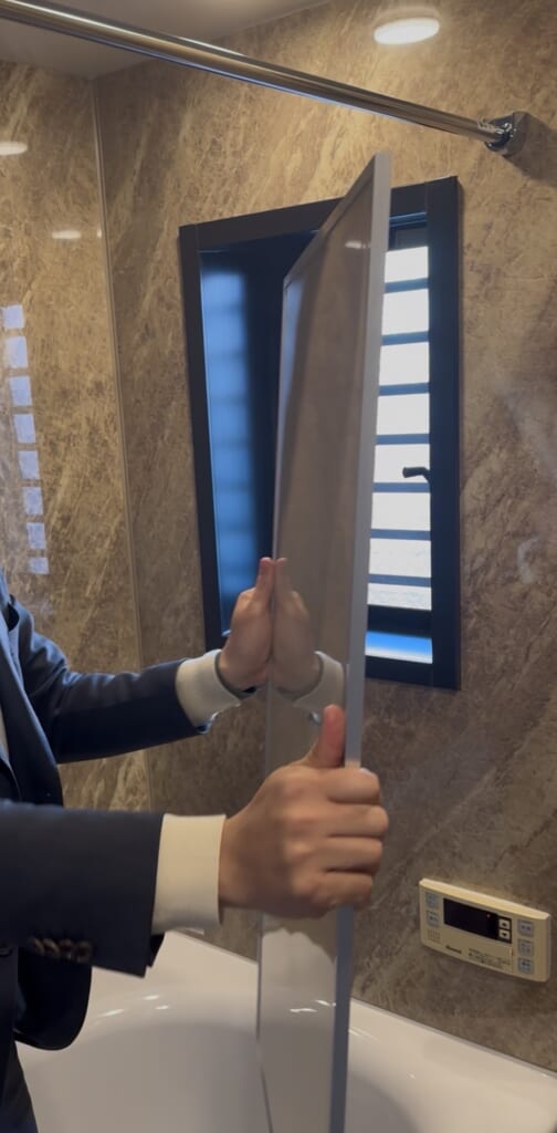 ・壁と同じ素材でオーダー作成:浴室の壁パネル材を窓サイズに合わせて精密にカット。周囲と完全に馴染むため、パネルを閉じれば窓の存在を忘れてしまうほどの一体感です。