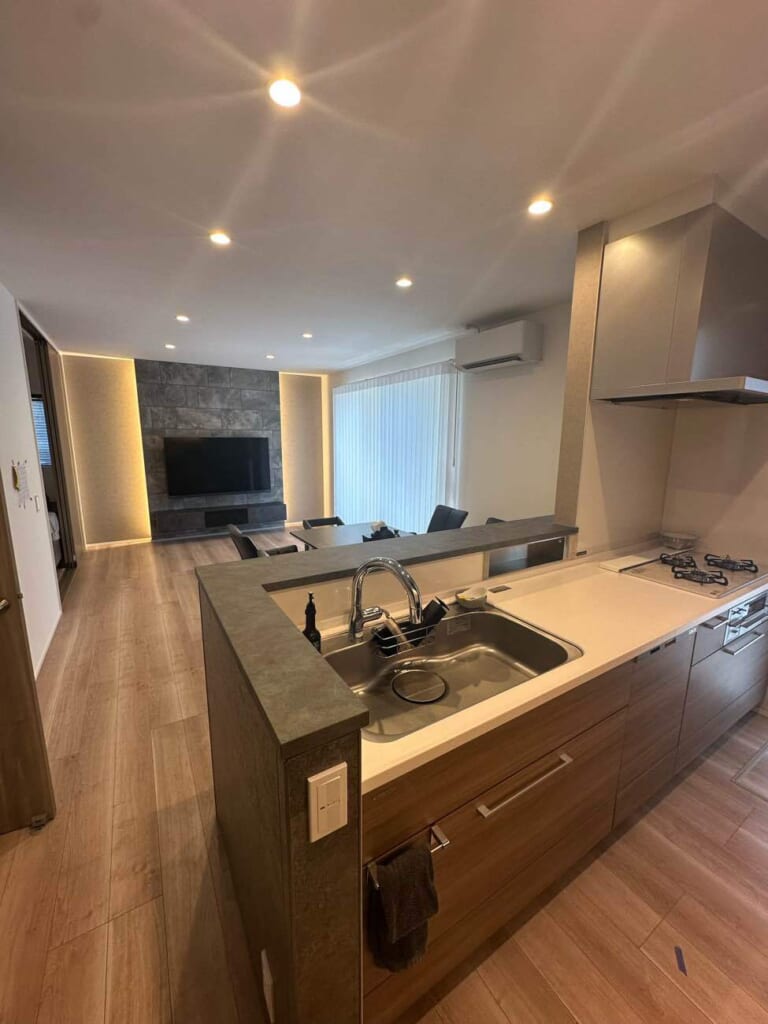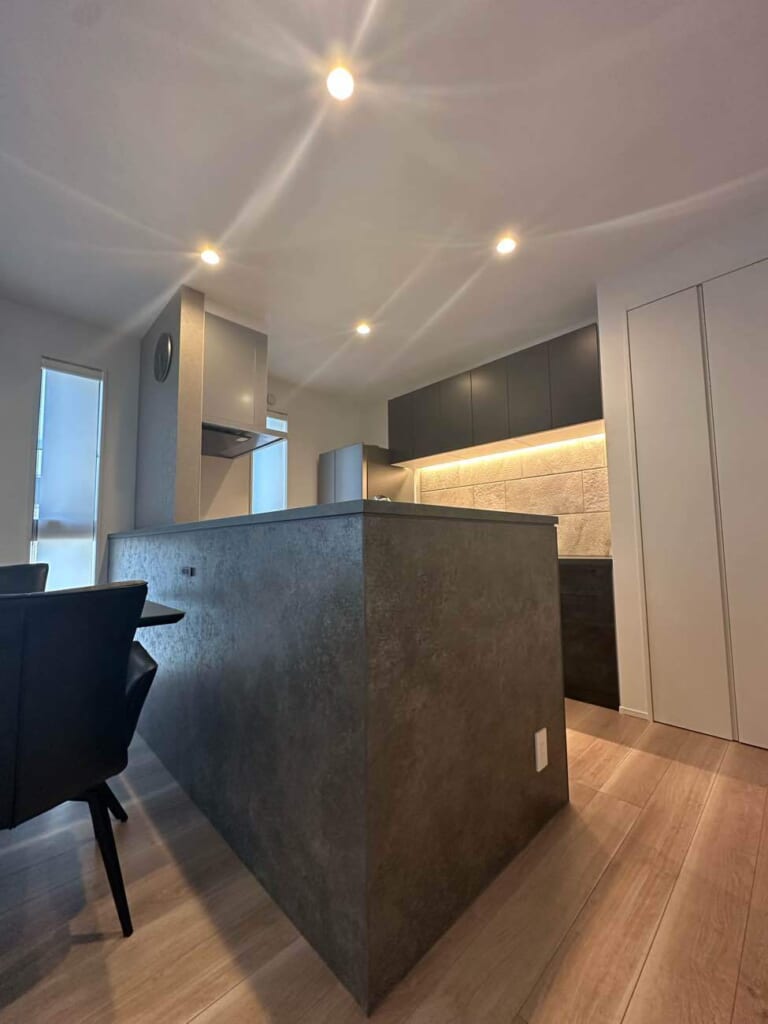 キッチン周りにおいても、トータルコーディネートを追求いたしました。カウンター天板には耐久性に優れたサンゲツの「リアテックシート」を、腰壁にはアイカ工業のパネルを採用しております。異なる素材を巧みに組み合わせることで、既製品にはないオーダーメイドのような質感と、LDK全体での統一感を持たせました。