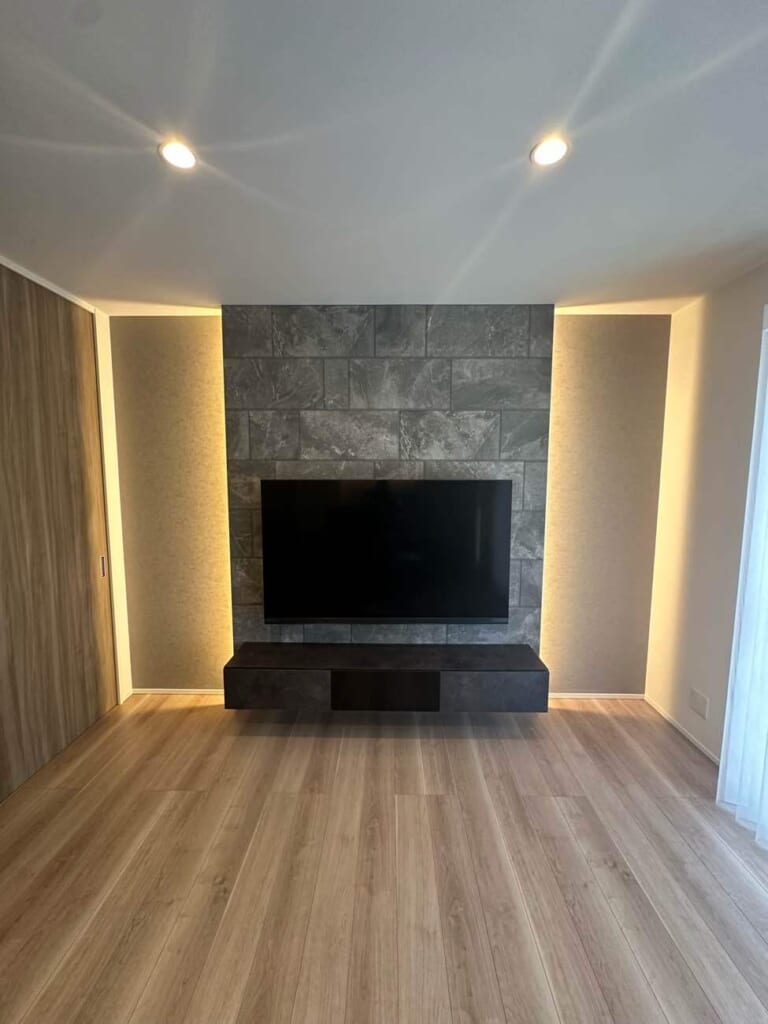 今回のリフォームの主役は、リビング一面に施したエコカラット「サンティエ(グレー)」です。石目の重厚な質感が壁掛けテレビを美しく引き立て、洗練された雰囲気を演出しています。事前に壁面補強と隠蔽配線を行うことで、ノイズのないスッキリとした外観を実現しました。